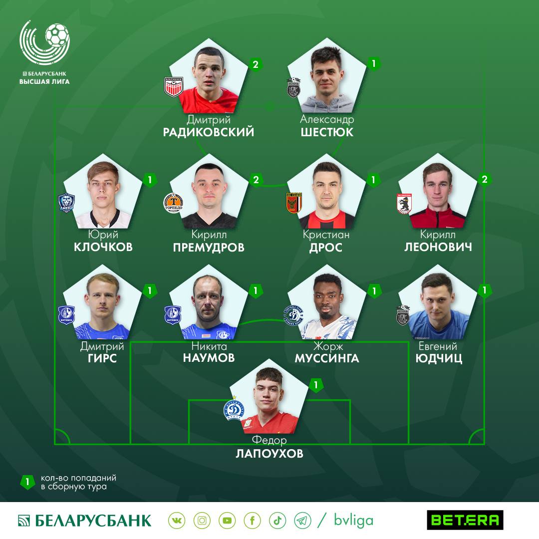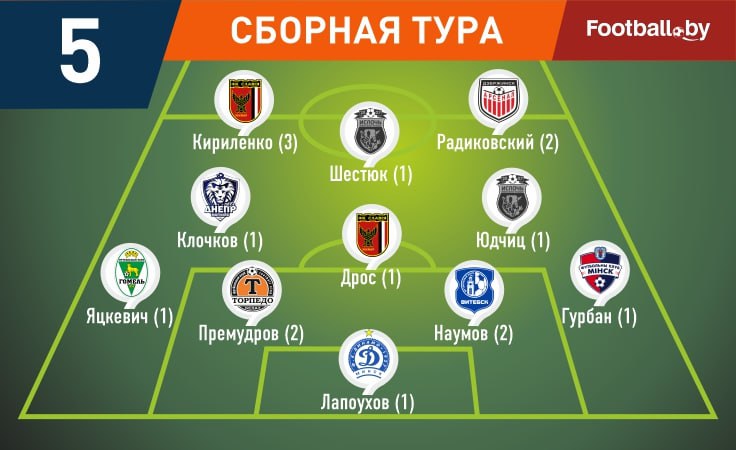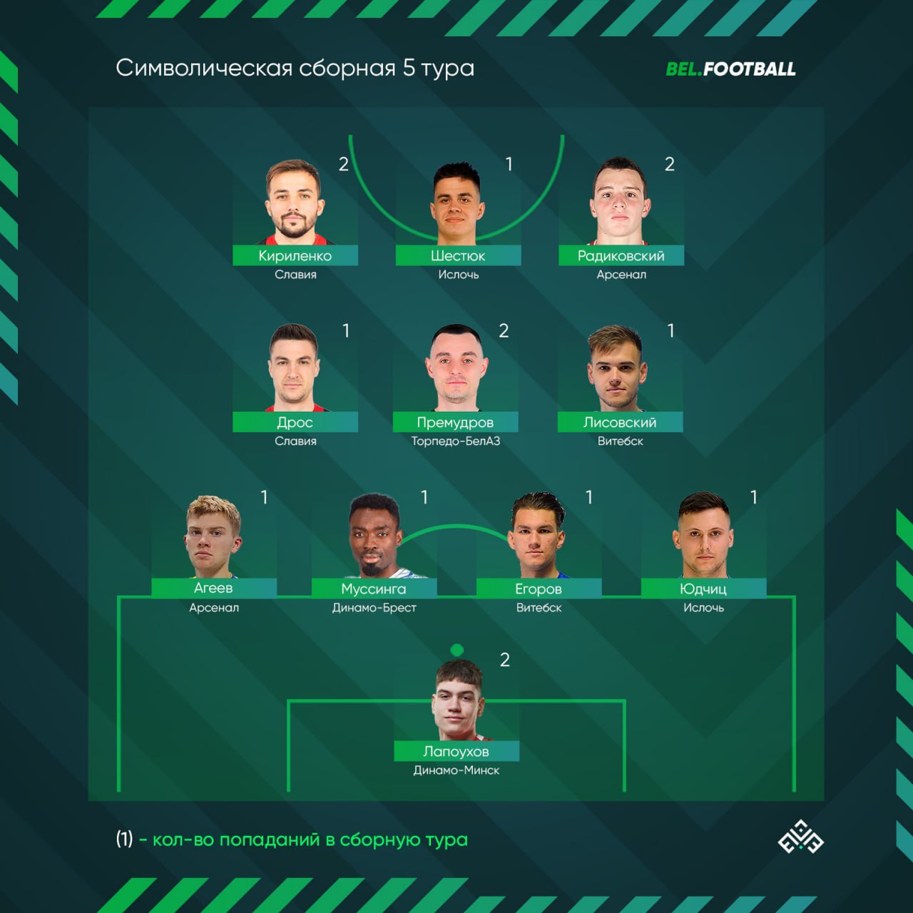 Ассоциация «Белорусская федерация футбола» опубликовала традиционный символический состав сборной пятого тура Беларусбанк – чемпионата Республики Беларусь по футболу среди команд высшей лиги сезона 2024 года. Уже второй раз в сезоне в него включен Кирилл Премудров.