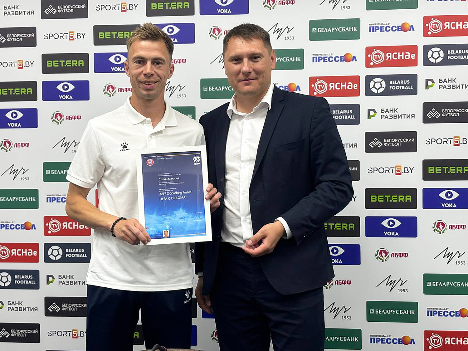 Торжественное вручение дипломов прошло вчера в Доме футбола. Степан Макаров получил свою лицензию из рук первого заместителя председателя АБФФ Андрея Василевича, а вот Сергея Ярошевича свидетельство о признании тренерского мастерства нашло позже – в день вручения дипломов он со своими воспитанницами из команды WU-13 находился на соревнованиях в Могилеве.