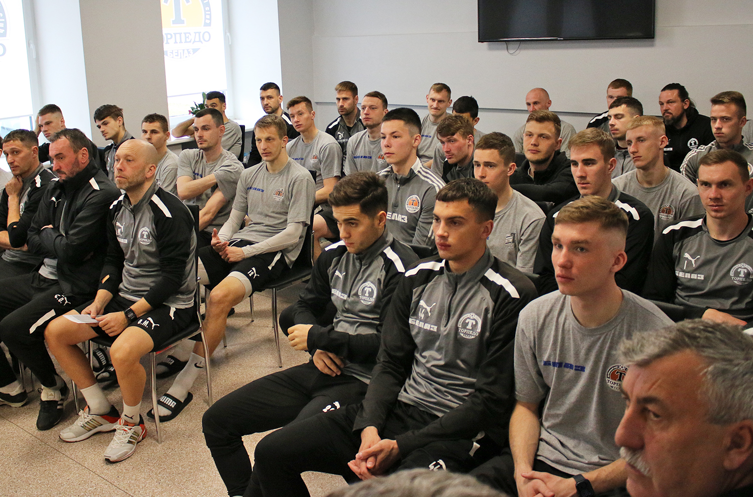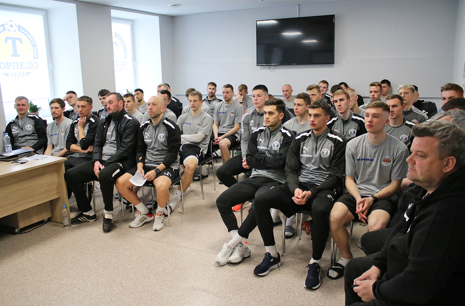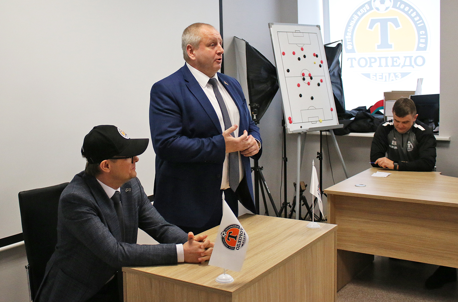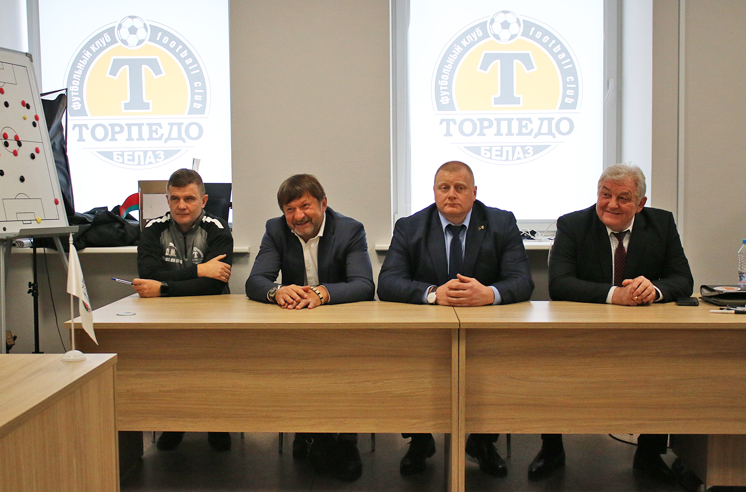 Сегодня состоялась встреча команды «ТОРПЕДО-БЕЛАЗ» с руководством клуба. На ней игрокам и тренерам представили нового председателя Совета директоров ООО «Футбольный клуб «ТОРПЕДО-БЕЛАЗ» – генерального директора ОАО «БЕЛАЗ» – управляющая компания холдинга «БЕЛАЗ-ХОЛДИНГ» Сергея Лесина.
